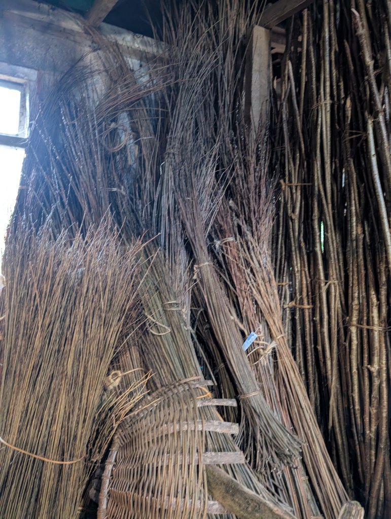 He also grows and harvests his own willow to make Welsh frame baskets, peels oak bark for a tannery in Devon (the last in the country to use oak bark, rather than synthetic materials), makes cleft oak gates and fencing/hurdles and harvests hazel for pea sticks, bean poles and line props, as well as making birch twig besoms.